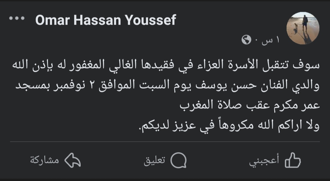 وكتب عمر حسن يوسف في منشوره الذي يرصده موقع تحيا مصر: سوف تتقبل الأسرة العزاء في فقيدها الغالي المغفور له بإذن الله والدي الفنان حسن يوسف يوم السبت الموافق ٢ نوفمبر بمسجد عمر مكرم عقب صلاة المغرب، ولا اراكم الله مكروهاً في عزيز لديكم.