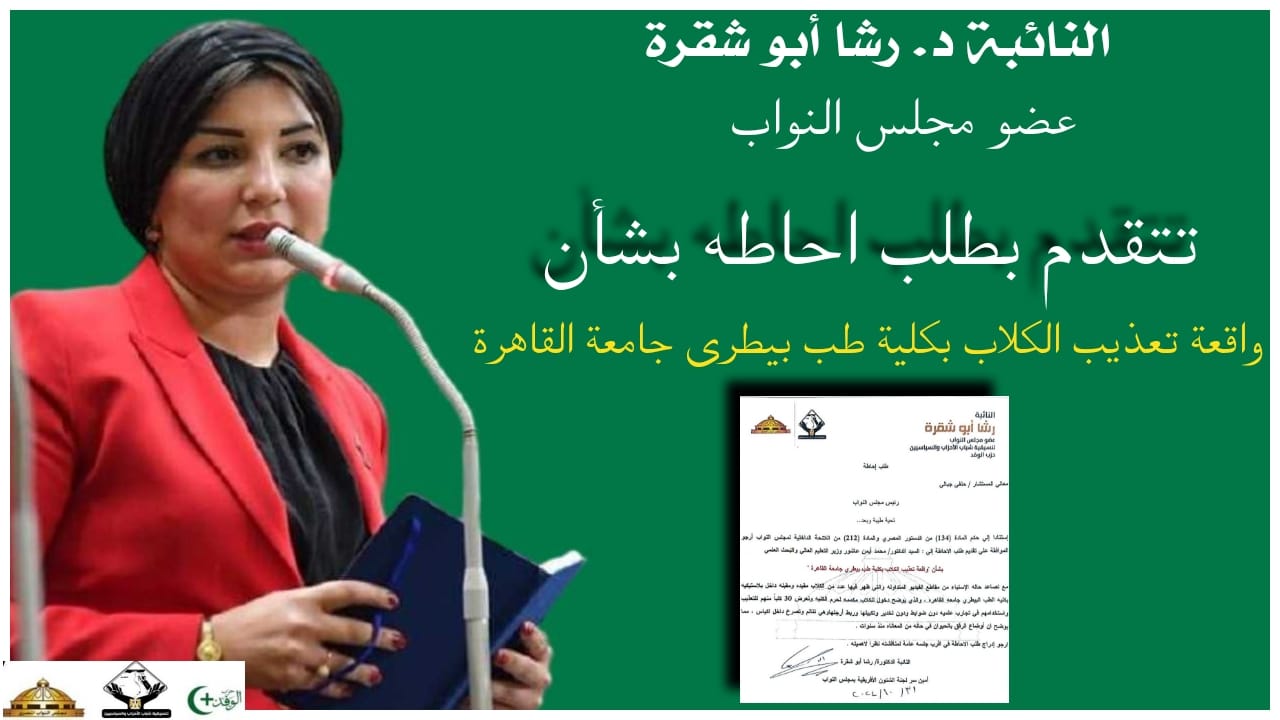 تقدمت النائبة الدكتورة رشا أبو شقرة عضو مجلس النواب عن تنسيقية شباب الأحزاب والسياسيين وأمين سر لجنة الشئون الأفريقية بمجلس النواب - بطلب احاطه موجه إلي الدكتور محمد أيمن عاشور وزير التعليم العالي والبحث العلمي بشأن "واقعة تعذيب الكلاب بكلية طب بيطري جامعة القاهرة " بتاريخ ٢٠٢٤/١٠/٣١.