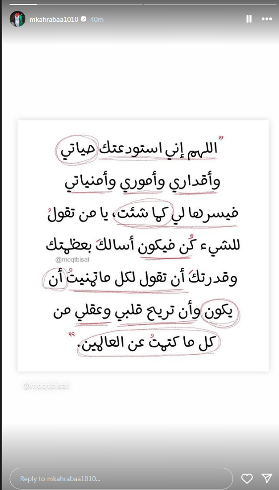 تحيا مصر، وعلق محمود عبد المنعم كهربا لاعب الأهلي، على قرار استبعاده من قائمة الفريق لمواجهة سيراميكا فى بطولة الدوري، وكتب اللاعب عبر حسابه الرسمي"إنستجرام": اللهم إني استودعتك حياتي وأقداري وأموري وأمنياتي، فيسرها لي كما شئت، يامن تقول للشئ كن فيكون، أسالك بعظمتك وقدرتك أن تقول لكل ماتمنين أن يكون، وأن تريح قلبي وعقلي من كل من كتمت عن العالمين".
