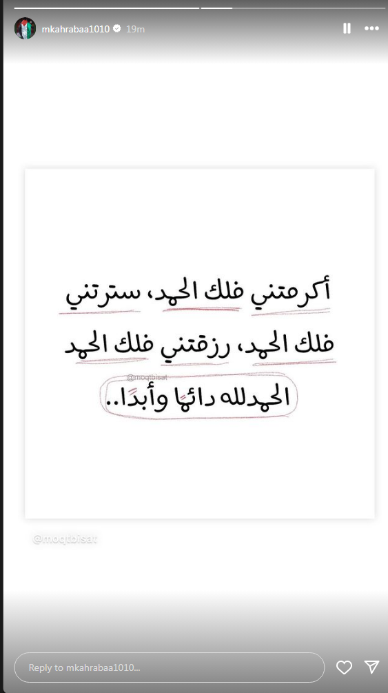 وتابع كهربا:" أكرمتني فلك الحمد ، سترتني فلك الحمد، رزقتني فلك الحمد .. والحمد لله دائماً وأبداً".