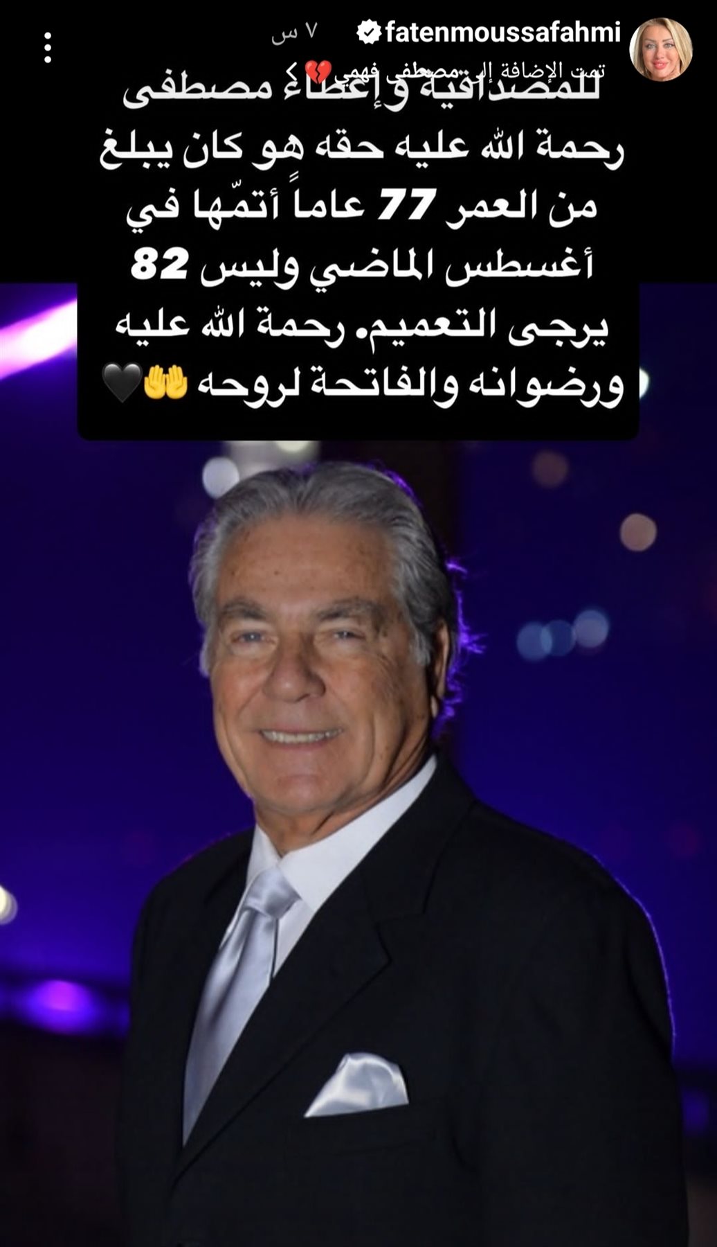 وقالت فاتن موسى طليقة الراحل مصطفى فهمي، «للمصداقية واعطاء مصطفى رحمة الله عليه حقه، هو كان يبلغ من العمر 77 عاما، اتمها في أغسطس الماضي، وليس 82 يرجى التعميم، رحمة الله عليه ورضوانه الفاتحة».