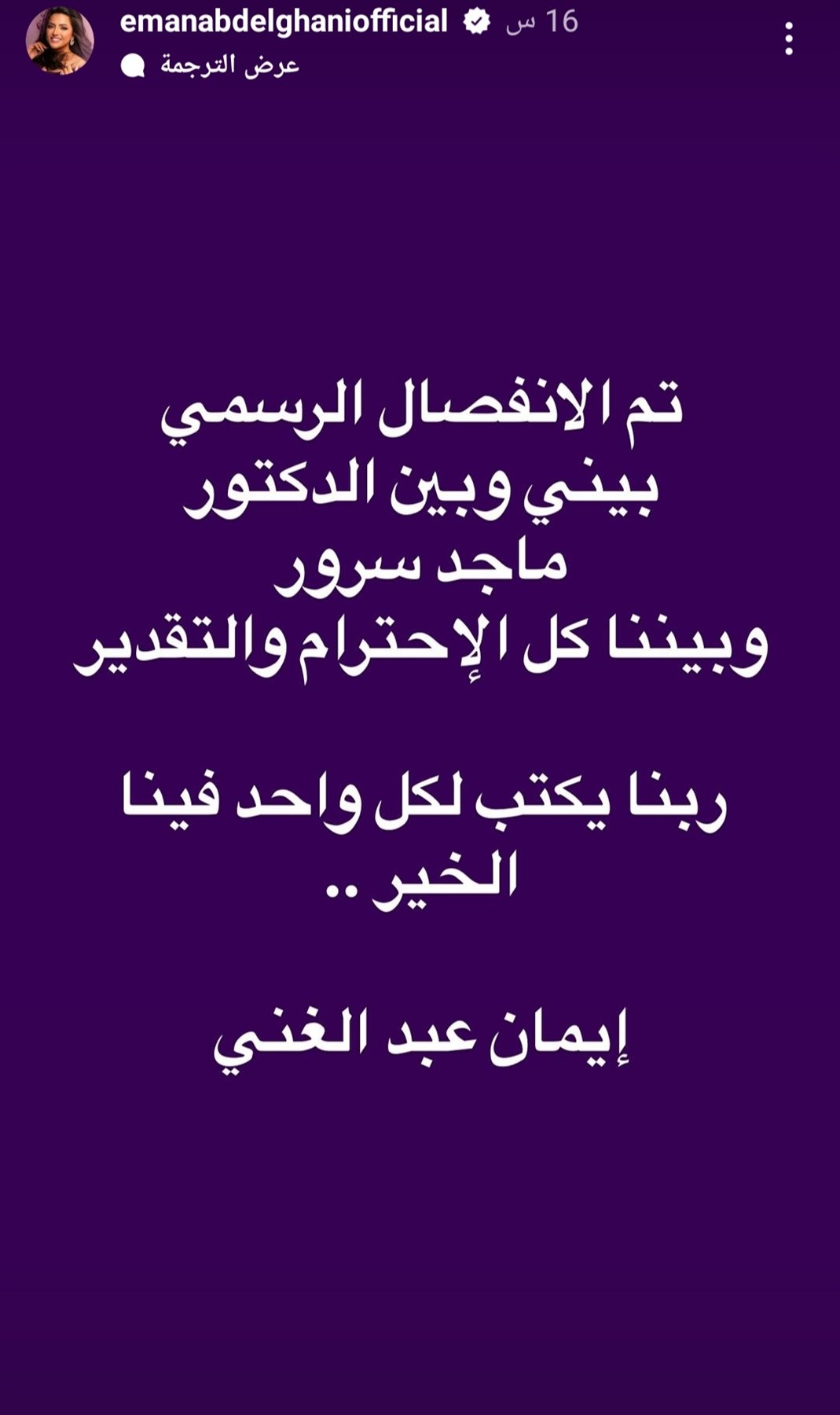 وكتبت إيمان عبد الغني في منشورها الذي رصده موقع تحيا مصر: تم الانفصال الرسمي بيني وبين الدكتور ماجد سرور وبيننا كل الإحترام والتقدير،ربنا يكتب لكل واحد فينا الخير، إيمان عبد الغني.