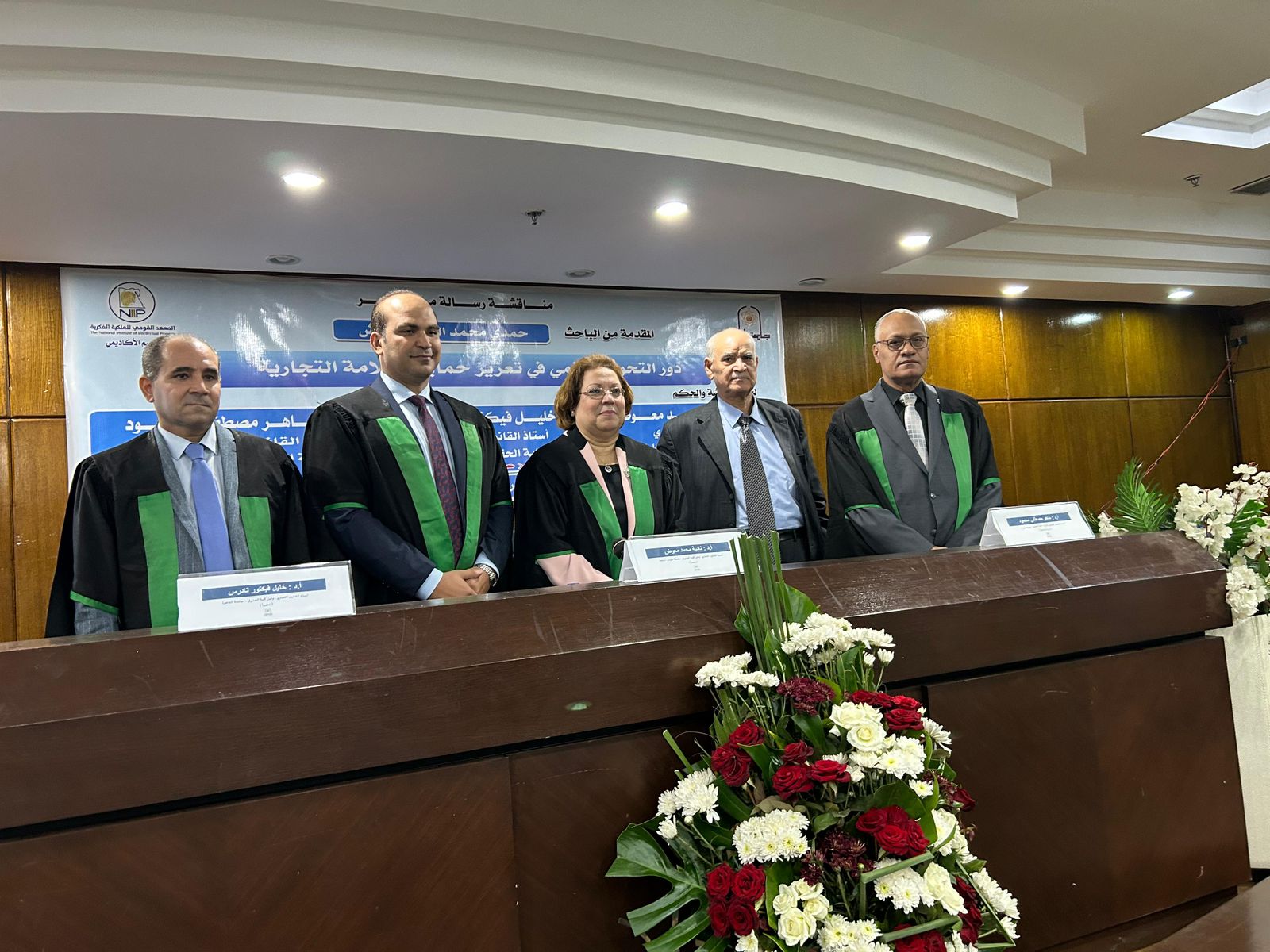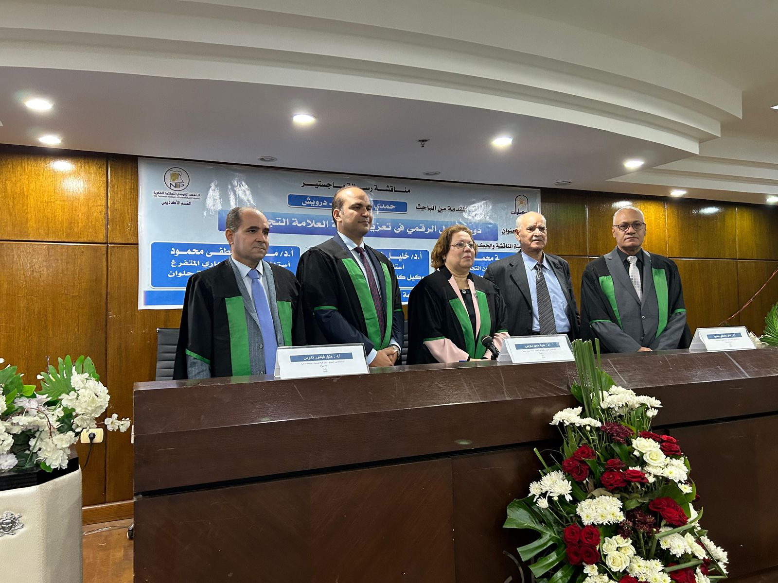 تشكلت لجنة المناقشة والحكم من نادية محمد معوض أستاذ القانون التجاري ووكيل كلية الحقوق جامعة حلوان الأسبق رئيساً، ود. خليل فيكتور تادرس أستاذ القانون التجاري ووكيل كلية الحقوق جامعة القاهرة عضواً، وأ.د/ ماهر مصطفى محمود أستاذ القانون التجاري المتفرغ بكلية الحقوق جامعة حلوان مشرفاً وعضواً".
