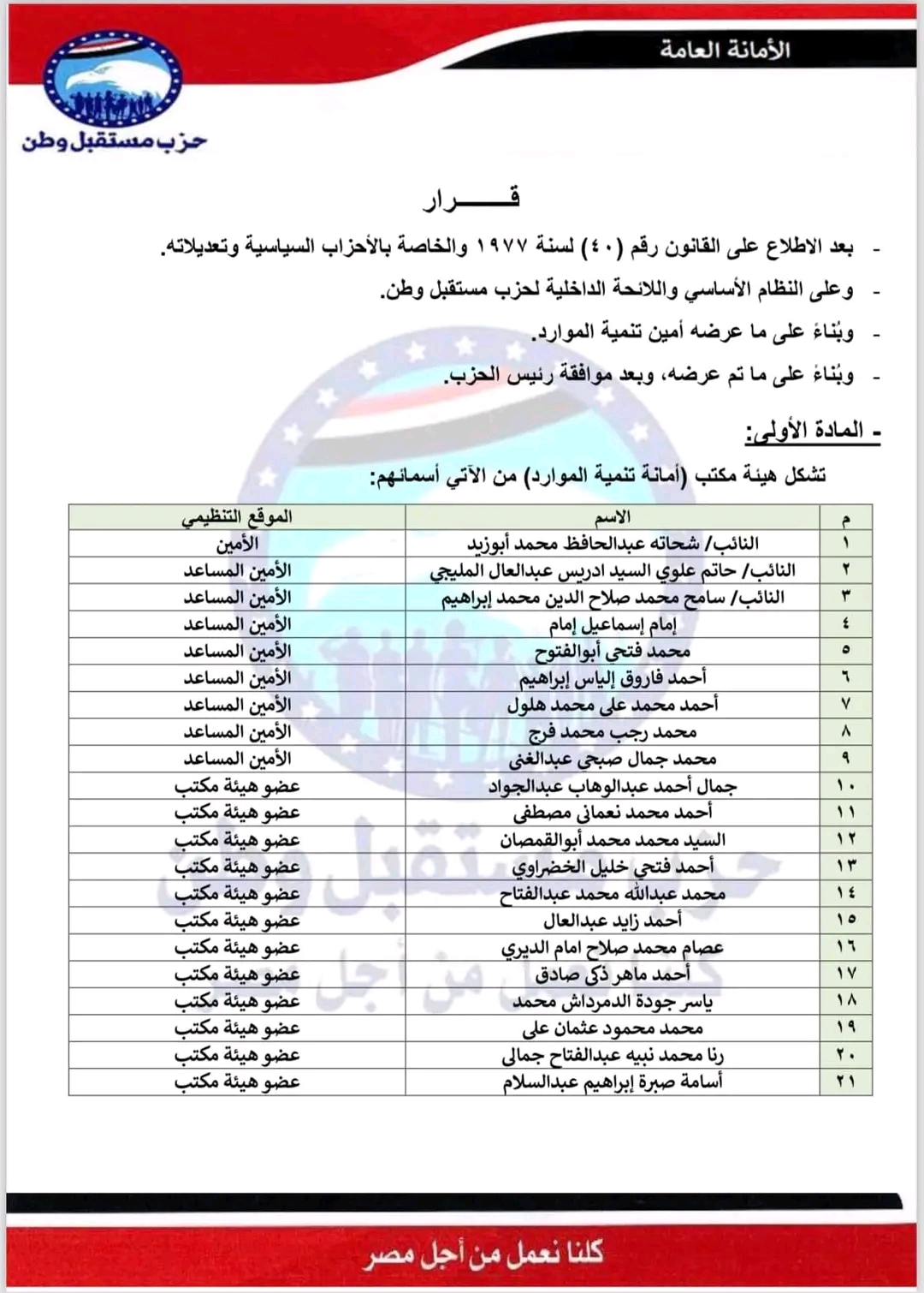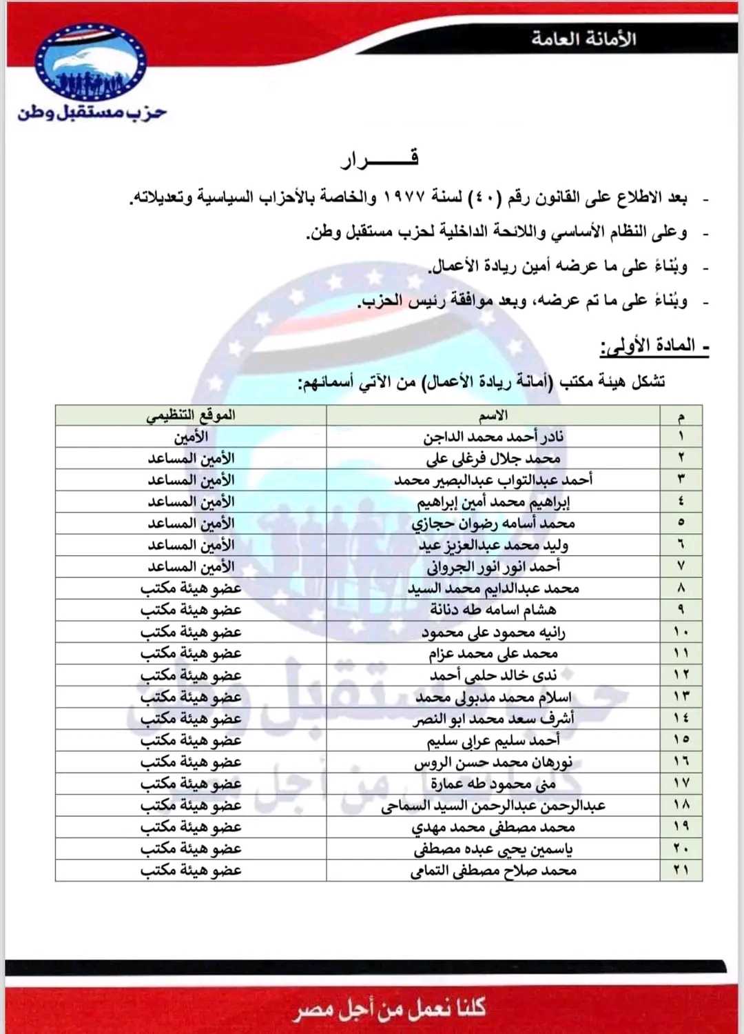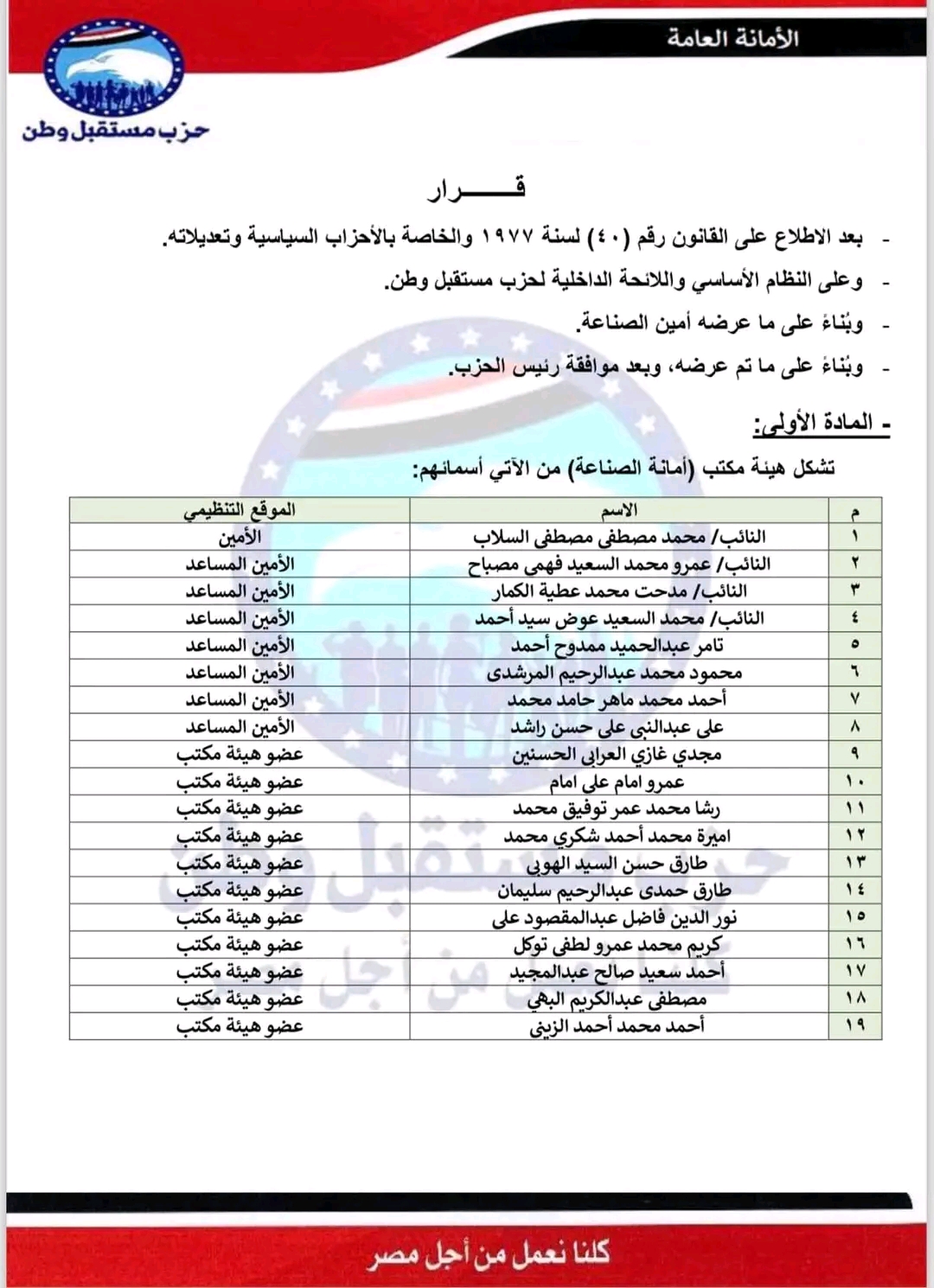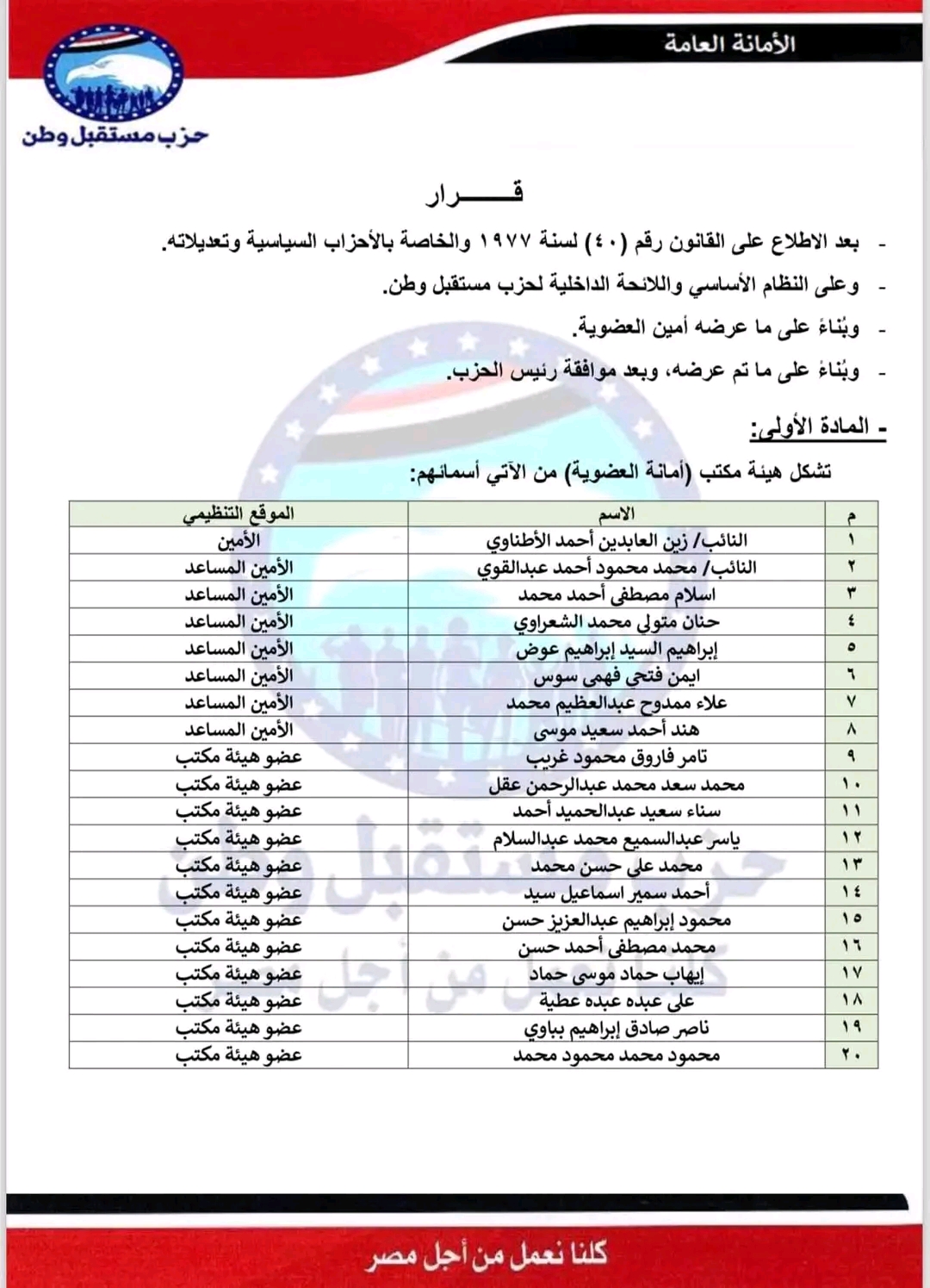 أصدر حزب مستقبل وطن مجموعة من القرارات التنظيمية بشأن تشكيل بعض الأمانات النوعية.