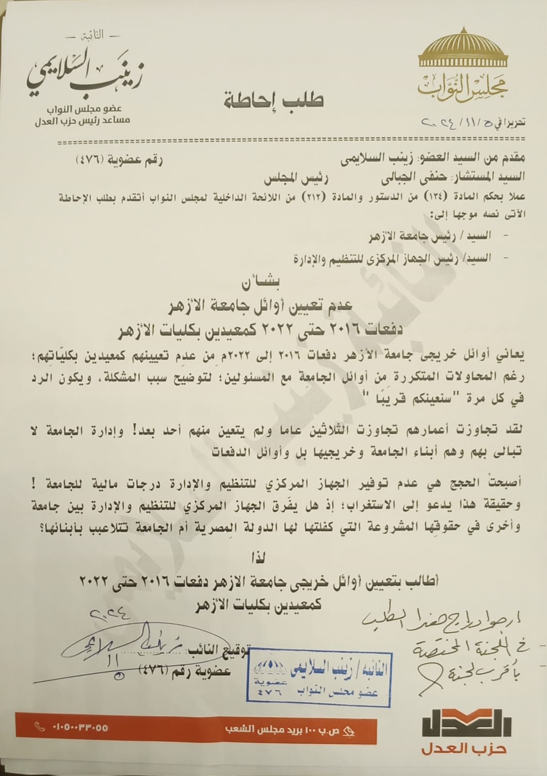 تقدمت النائبة زينب السلايمي ، عضو مجلس النواب بطلب إحاطة إلى رئيس جامعة الأزهر ورئيس الجهاز المركزي للتنظيم والإدارة، بشأن عدم تعيين أوائل جامعة الأزهر دفعات 2016 حتي 2022 كميعدين بكليات الأزهر، عملاً بحكم المادة 134 من الدستور والمادة 212 من اللائحة الداخلية لمجلس النواب.