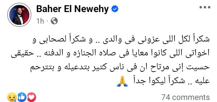 وكتب باهر النويهي عبر حسابه الرسمي بموقع التواصل الاجتماعي فيسبوك في منشور رصده موقع تحيا مصر: شكراً لكل اللى عزونى فى والدى .. و شكراً لصحابى و اخواتى اللى كانوا معايا فى صلاه الجنازه و الدفنه .. حقيقى حسيت إنى مرتاح ان فى ناس كتير بتدعيله و بتترحم عليه .. شكراً ليكوا جداً.