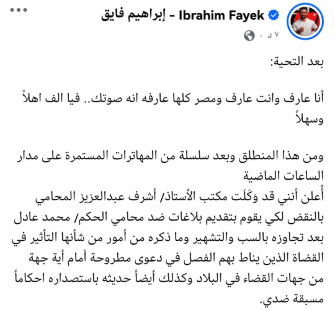 وكتب إبراهيم فارق، عبر حسابه الرسمي غلى “ فيس بوك”، وقال: “ بعد التحية:أنا عارف وأنت عارف ومصر كلها عارفة انه صوتك.. فيا ألغ اهلاً وسهلاً”.