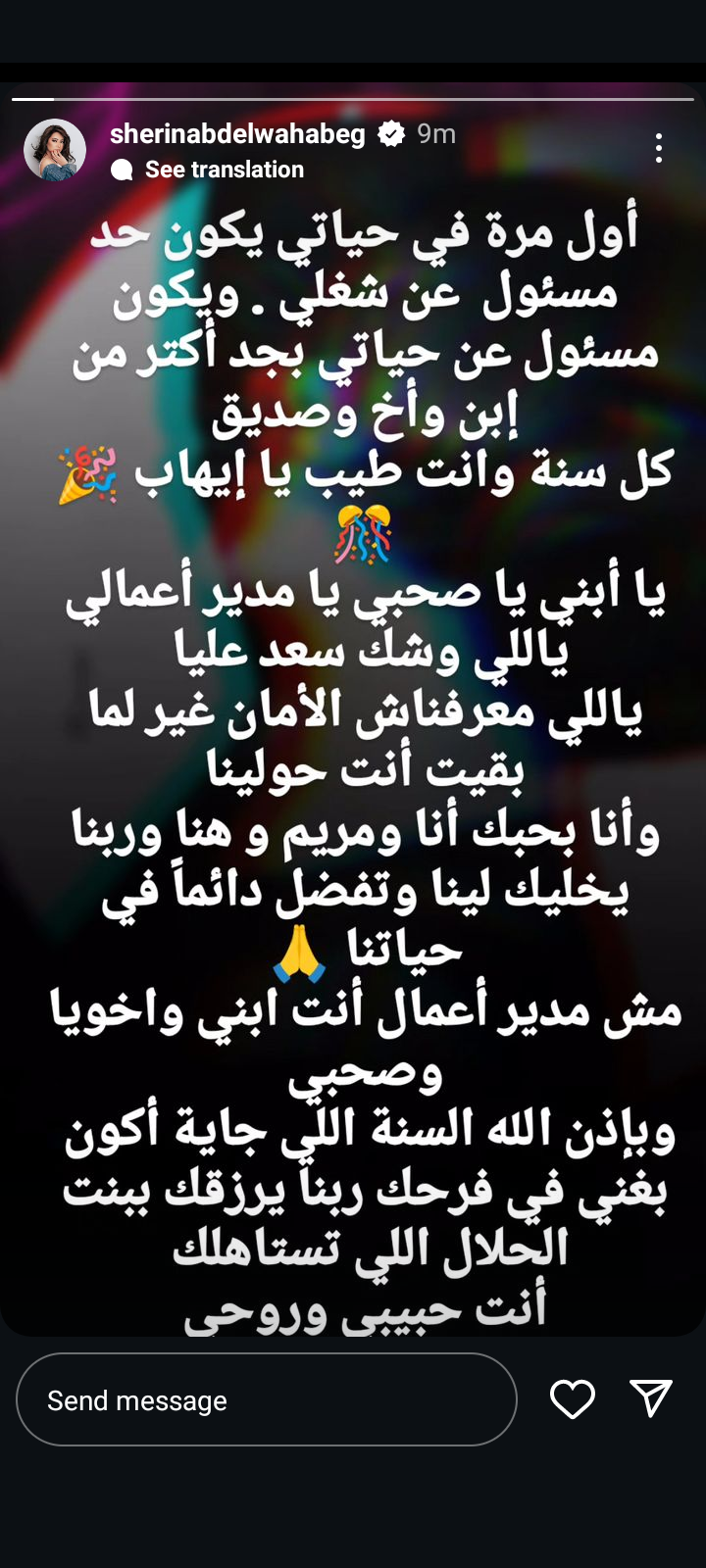 وتابعت شيرين عبد الوهاب حديثها: أنا بحبك انا ومريم وهنا وربنا يخليك لينا وتفضل دائما في حياتنا، مش مدير أعمال انت ابني واخويا وصحبي وبإذن الله السنة الجاية أكون بغني في فرحك وربنا يرزقك ببنت الحلال اللي تستاهلك.
