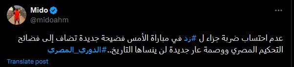 وأكمل أحمد حسام ميدو، عدم احتساب ضربة جزاء لنادي زد في مباراة الأمس فضيحة جديدة تضاف إلى فضائح التحكيم المصري ووصمة عار جديدة لن ينساها التاريخ.