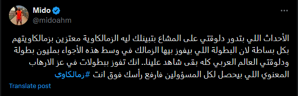 وتابع أحمد حسام ميدو، دلوقتي العالم العربي كله بقى شاهد علينا، إنك تفوز ببطولات في عز الإرهاب المعنوي اللي بيحصل لكل المسؤولين فارفع رأسك فوق إنت زمالكاوي.