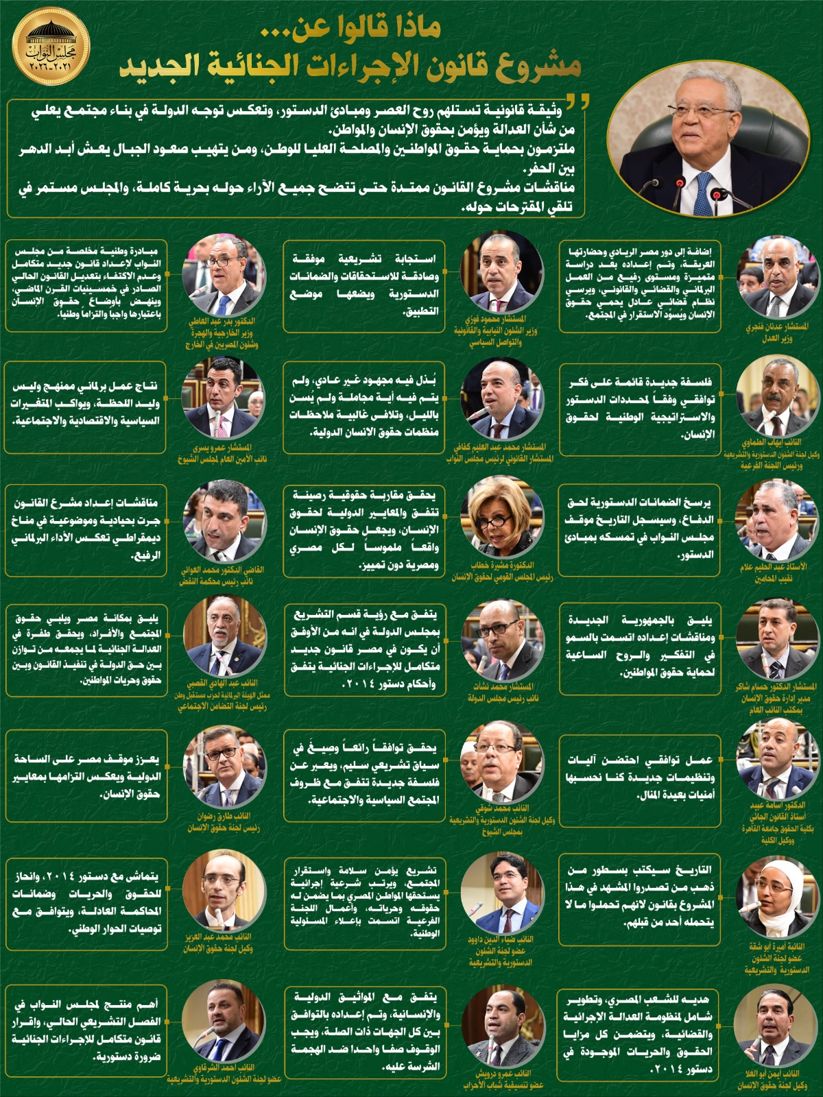 الذي يمثل قانوناً متكاملاً للإجراءات الجنائية يحقق فلسفة جديدة تتسق مع دستور ٢٠١٤، والاستراتيجية الوطنية لحقوق الإنسان، ويتلافى العديد من الملاحظات والتوصيات الصادرة عن بعض الأجهزة التابعة للمنظمات الدولية الرسمية، بما يتواكب مع التطور التكنولوجي، وذلك كُله بما يحقق المصلحة العليا للدولة في مجال حقوق الإنسان على الصعيدين الداخلي والدولي، ويحقق الاستقرار المنشود للقواعد الإجرائية، حيث تضمن مزيداً من ضمانات الحقوق والحريات للمواطن المصري بما يليق بالجمهورية الجديدة على النحو الوارد بتقرير اللجنة المشتركة بشأنه.