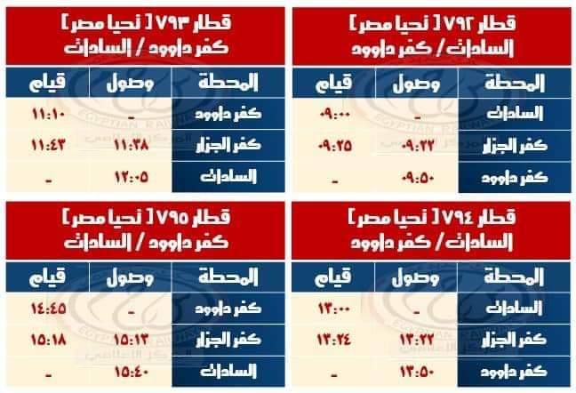 • تشغيل قطار 794 السادات / كفر داوود حيث يقوم من محطة السادات 13:00 يصل محطة كفر داوود الساعة 13:50 بتركيب ( 5 عربات تحيا مصر ) كالجدول المرفق .