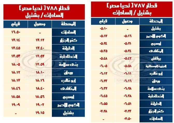• تشغيل قطار 787 بشتيل / السادات يقوم من محطة بشتيل الساعة 05:10 يصل محطة السادات الساعة 07:50 بتركيب ( 5 عربات تحيا مصر ) كالجدول المرفق .