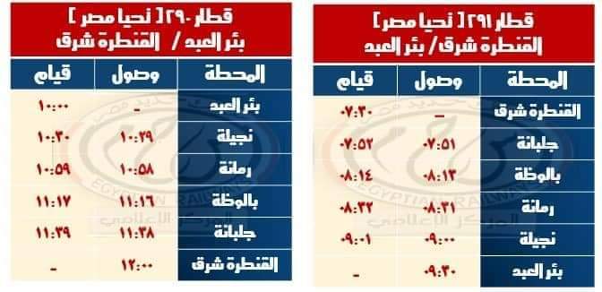 • تشغيل قطار 292 يقوم من محطة بئر العبد الساعة 15:00 يصل محطة القنطرة شرق الساعة 17:00 بتركيب ( 4 عربات تحيا مصر ) كالجدول المرفق .