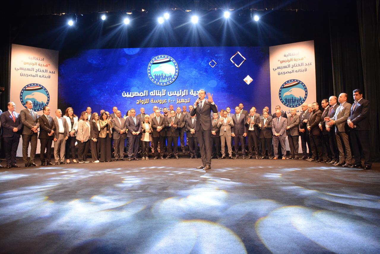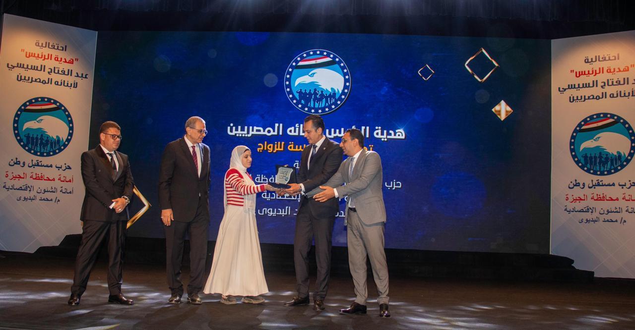 توزيع هدايا الرئيس على أبنائه بمحافظة الجيزة بتوزيع ١٠٠ جهاز عروس متكامل برعاية أمانة الشئون الاقتصادية بالمحافظة بقيادة المهندس محمد البديوي