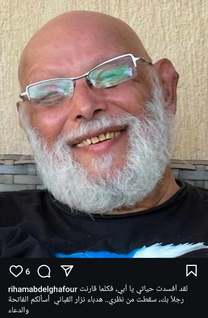 وكتبت ريهام عبد الغفور في منشور رصده موقع تحيا مصر على حسابها الرسمي بموقع انستجرام: لقد أفسدت حياتي يا أبي، فكلما قارنت رجلا بك سقط من نظري.. هدباء نزار القباني.. اسألكم الدعاء والفاتحة لأبي.