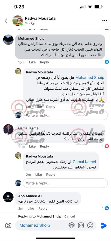 وتابعت زوجة اللواء رؤوف السيد رئيس الحزب الذي وافته المنية منذ أسابيع خلال احدى التعليقات على المنشور متسائلة :" هل يصح ايا كان وضعه في هذا الحزب ان لا يقبل ترشح الا شخص بعينه وهذا الشخص كان قد استقال منذ ثلاثة سنوات ، اما الباقي سيكون داخل الحزب ، يا خسارتك يا رؤوف لم أرى أشرف منه طوال حياتي ".