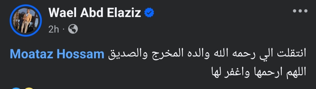 رحلت عن عالمنا والدة المخرج معتز حسام وأعلن معتز حسام نبأ وفاة والدته من خلال منشور عبر حسابه الشخصي على موقع التواصل الاجتماعي فيسبوك، ونرصد في هذا المقال موعد ومكان عزاء والدة المخرج معتز حسام.