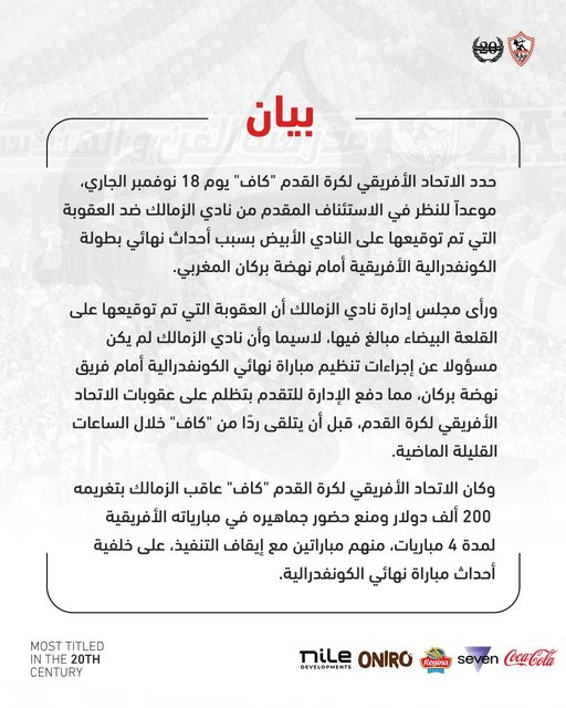 وجاء في بيان الزمالك أن إدارة النادي كانت لها رؤية بأن العقوبات التي تم توقيعها على الفريق مبالغ فيها وأن الزمالك لم يكن مسئولا عن إجراءات تنظيم مباراة نهائي الكونفدرالية أمام نهضة بركان.