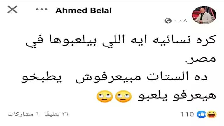 وكان قد كتب أحمد بلال عبر صفحته الشخصية على فيس بوك: "كرة نسائية ايه اللي بيلعبوها في مصر.. ده الستات مبيعرفوش يطبخوا، هيعرفوا يلعبوا".