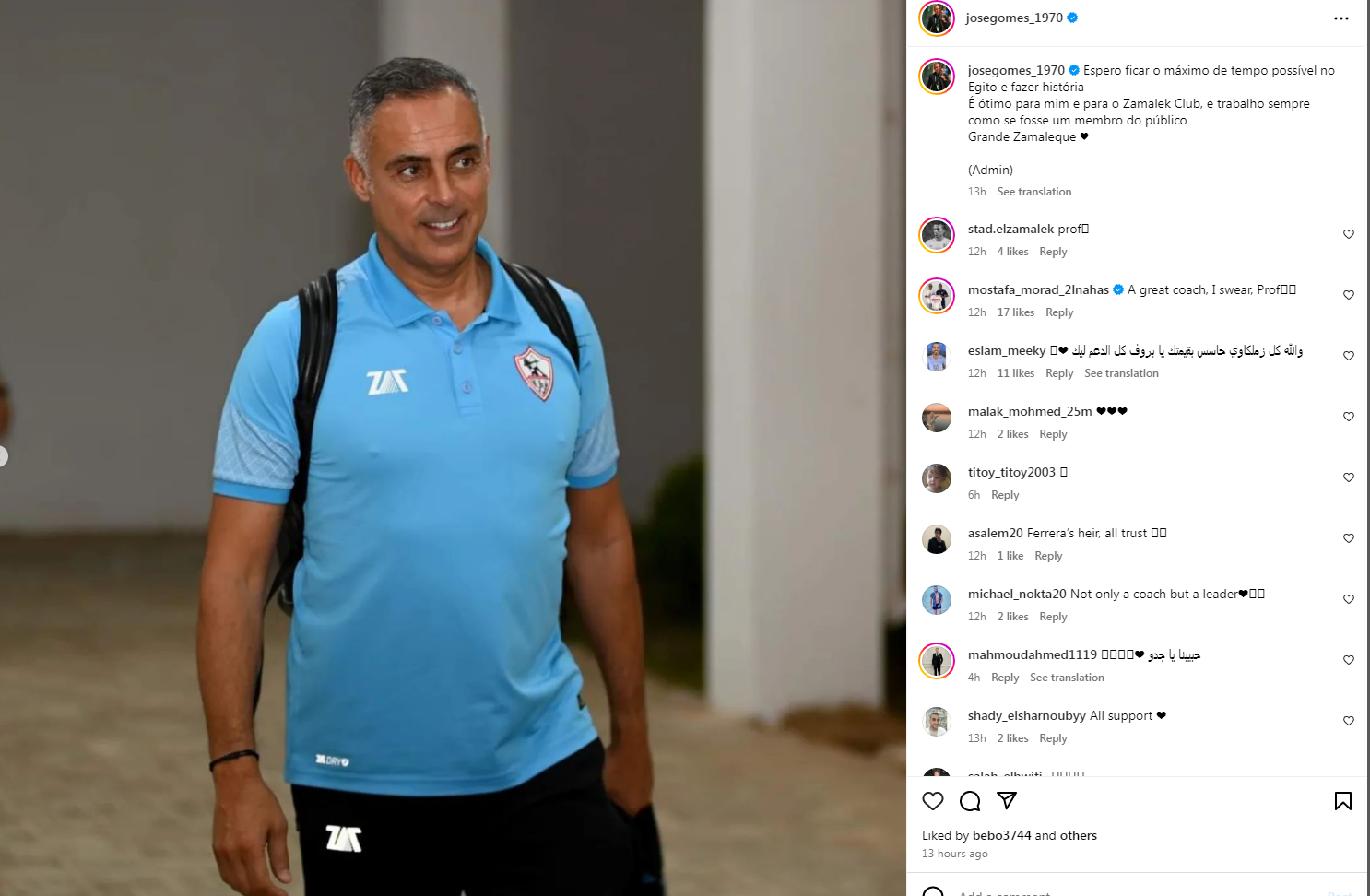 تحيا مصر، وكتب جوزيه جوميز عبر حسابه الرسمي "إنستجرام": أتمنى البقاء في مصر أطول فترة ممكنة وصناعة تاريخ لي ولنادي الزمالك .. أعمل دائماً كعضو من جمهور الزمالك العظيم".