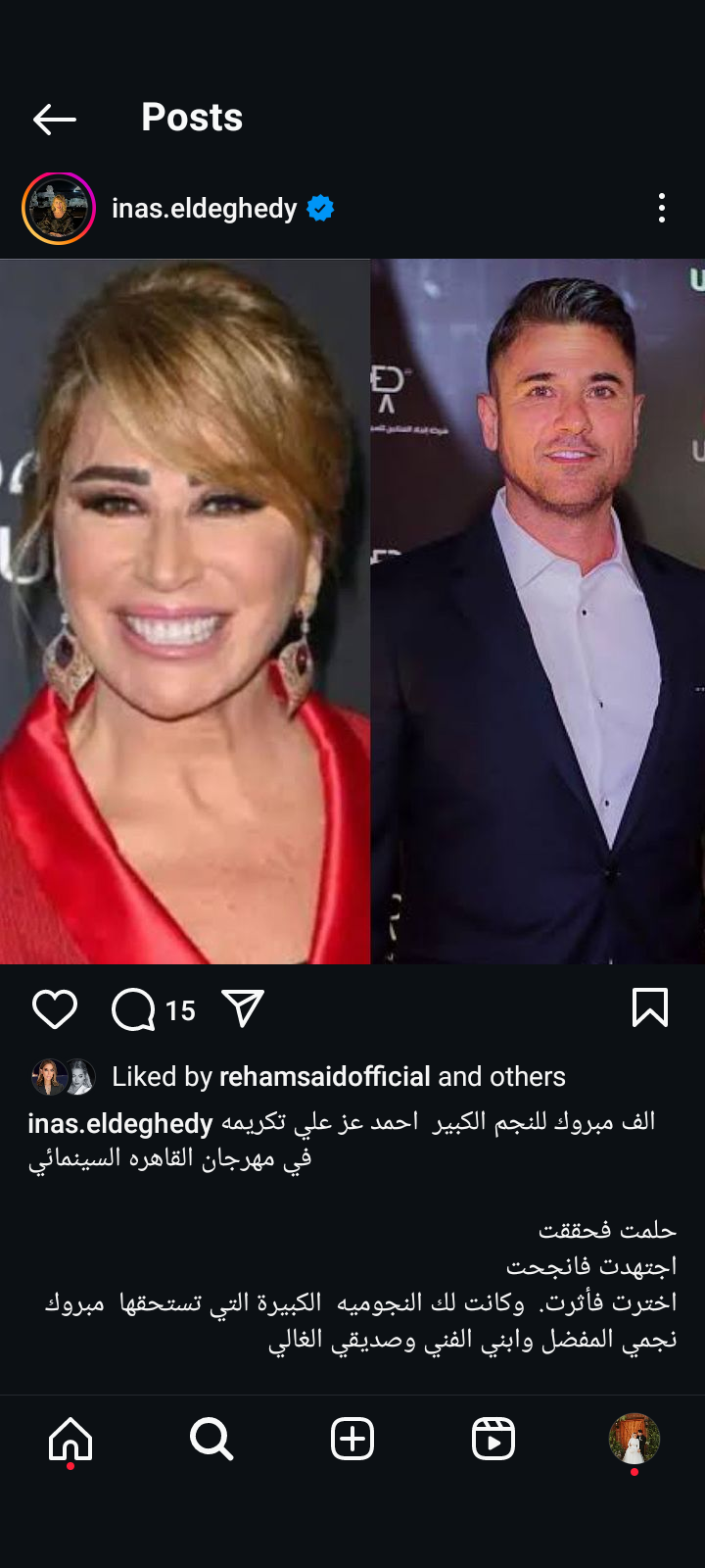 وكتبت إيناس الدغيدي في منشور رصده موقع تحيا مصر عبر حسابه الرسمي بموقع تبادل الصور والفيديوهات انستجرام، مرفقة صورتها إلى جانب الفنان أحمد عز: ألف مبروك للنجم الكبير احمد عز علي تكريمه في مهرجان القاهره السينمائي، حلمت فحققت و اجتهدت فانجحت واخترت فأثرت وكانت لك النجوميه الكبيرة التي تستحقها.
