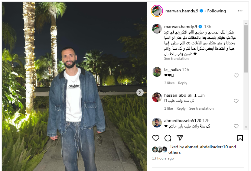 تحيا مصر، وكتب مروان حمدي عبر إنستجرام:" شكرا لكل اصحابي و حبايبي اللي افتكروني في عيد ميلادي حقيقي بتبسط جدا باللحظات دي حتي لو الدنيا وخدانا، ومش بنتكلم بس الأوقات دي اللي بيظهر فيها حبنا، و اهتمامنا لبعض شكرا جدا لكم و كل سنة وأنتم طيبين وفي راحة بال".