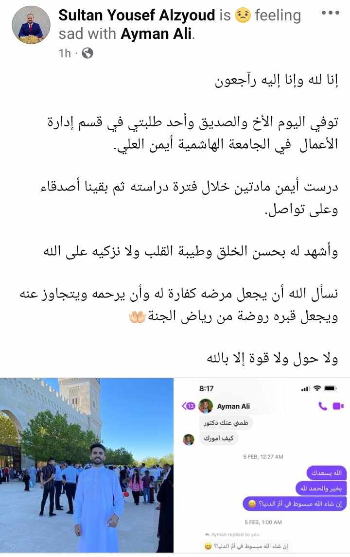 وحرص أستاذ أيمن العلي على نشر صور ومحادثات بينه وبين الراحل ملك جمال الاردن، وكتب عليها عبر حسابه الرسمي بموقع التواصل الاجتماعي فيسبوك: إنا لله وإنا إليه رآجعون توفي اليوم الأخ والصديق وأحد طلبتي في قسم إدارة الأعمال في الجامعة الهاشمية أيمن العلي.ط، درست أيمن مادتين خلال فترة دراسته ثم بقينا أصدقاء وعلى تواصل.