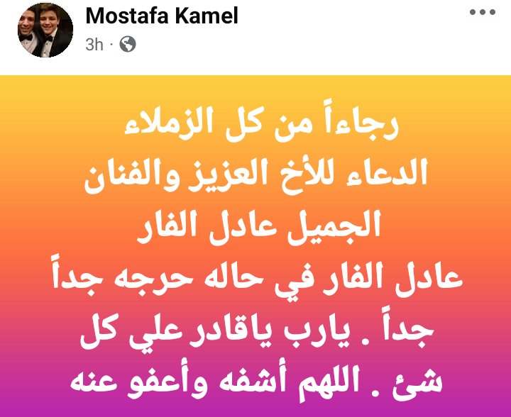 وكتب مصطفى كامل في منشور رصده موقع تحيا مصر عبر حسابه الرسمي بموقع التواصل الاجتماعي فيسبوك: رجاءاً من كل الزملاء الدعاء للأخ العزيز والفنان الجميل عادل الفار، عادل الفار في حاله حرجه جداً جداً، يارب ياقادر علي كل شئ،.. اللهم أشفه وأعفو عنه.