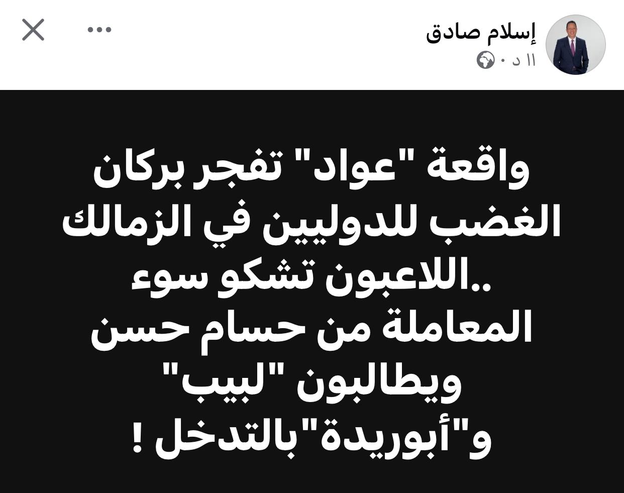 وكتب إسلام صادق على فيسبوك، واقعة "عواد" تفجر بركان الغضب للدوليين في الزمالك ..اللاعبون تشكو سوء المعاملة من حسام حسن ويطالبون "لبيب" و"أبوريدة"بالتدخل!.