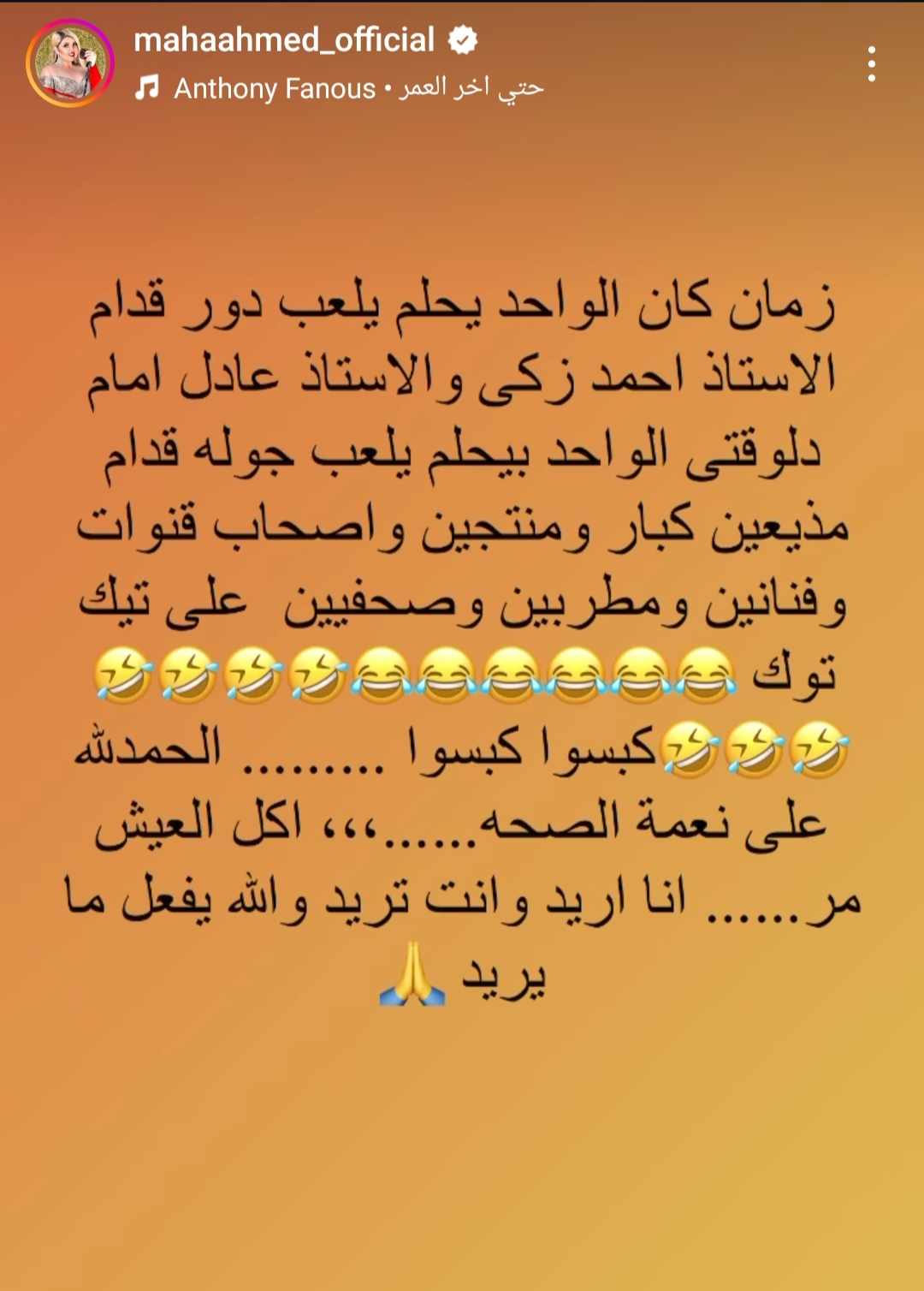 وقالت مها أحمد في منشور رصده موقع تحيا مصر عبر حسابها الرسمي بموقع تبادل الصور والفيديوهات انستجرام: زمان كان الواحد يحلم يلعب دور قدام الأستاذ أحمد زكى والأستاذ عادل إمام دلوقتي الواحد بيحلم يلعب جولة قدام مذيعين كبار ومنتجين وأصحاب قنوات وفنانين وصحفيين على تيك تيك.. الحمد لله على نعمة الصحة.. أكل العيش مر و أنا أريد وأنت تريد والله يفعل ما يريد.
