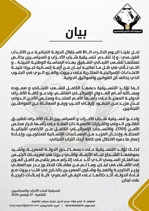 تقدمت تنسيقية شباب الأحزاب و السياسيين بخالص تهنئتها للشعب اللبناني الشقيق بمناسبة الذكرى الـ81 لاستقلال الدولة اللبنانية عن الانتداب الفرنسي، هذه المناسبة الوطنية النبيلة، والتي تأتي في ظل ما تعانيه لبنان من أزمة إنسانية كبيرة؛ نتيجة الاعتداءات الإسرائيلية المتكررة على بيروت، والغزو البري في الجنوب الذي يخالف كل القوانين والمواثيق الدولية.