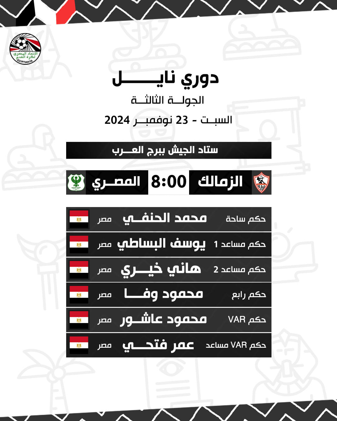 يتواجد محمد الحنفي كحكم ساحة لإدارة مباراة حكام مباراة الزمالك والمصري البورسعيدي في الدوري المصري الممتاز، بينما يتواجد يوسف اسنباطي حكم مساعد أول، وهاني خيري حكم مساعد ثاني، ويتواجد محمود وفا كحكم رابع.