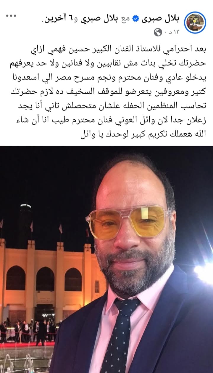 وأرفق المنتج بلال صبري منشور عبر حسابه الرسمي على موقع التواصل الاجتماعي فيسبوك علق من خلاله على أزمة الفنان وائل عوني والموقف الذي تعرض له على أبواب دار الأوبرا المصرية أثناء حضوره مهرجان القاهرة، وأعرب بلال صبري خلال منشوره عن استياءه مما حدث قائلًا: "مع احترامي للأستاذ الفنان الكبير حسين فهمي، إزاي حضرتك تخلي بنات مش نقابيين ولا فنانين ولا حد يعرفهم يدخلوا عادي، وفنان محترم ونجم زي وائل عوني يتعرض للموقف السخيف ده؟ لازم حضرتك تحاسب المنظمين علشان متحصلش تاني".
