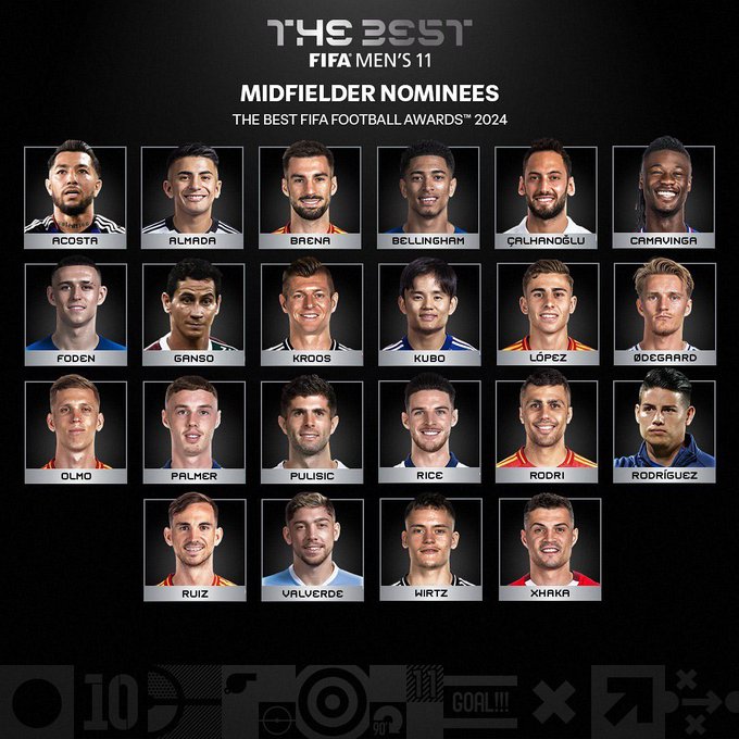 وتم ترشيح 22 لاعبا من جائب الفيفا لقائمة أفضل لاعب خط وسط في العالم 2024، ويتواجد فيل فودين لاعب مانشستر سيتي الإنجليزي والمعتزل توني كروس وداني أولمو بطل اليورو مع منتخب إسبانيا.