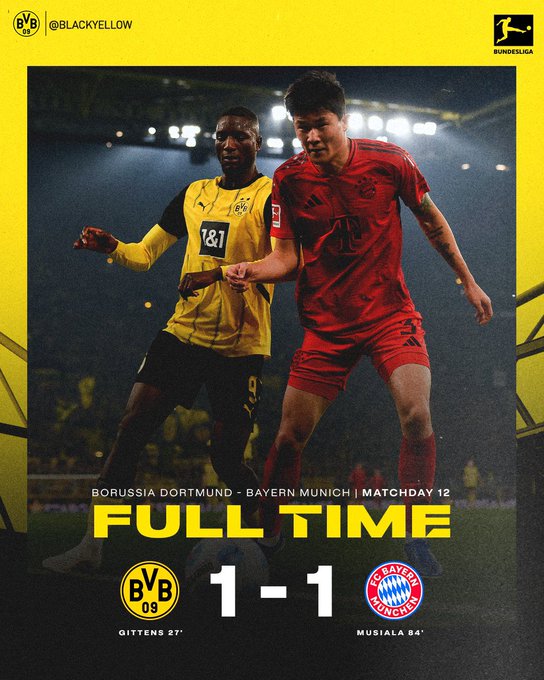 لتنتهي المباراة بالتعادل الإيجابي ويتقاسم كلا الفريقين نقاط المباراة، والتي جمعت بين فريقي بايرن ميونخ وبروسيا دورتموند ضمن مباريات الجولة الـ 12 من عمر بطولة الدوري الألماني الممتاز.
