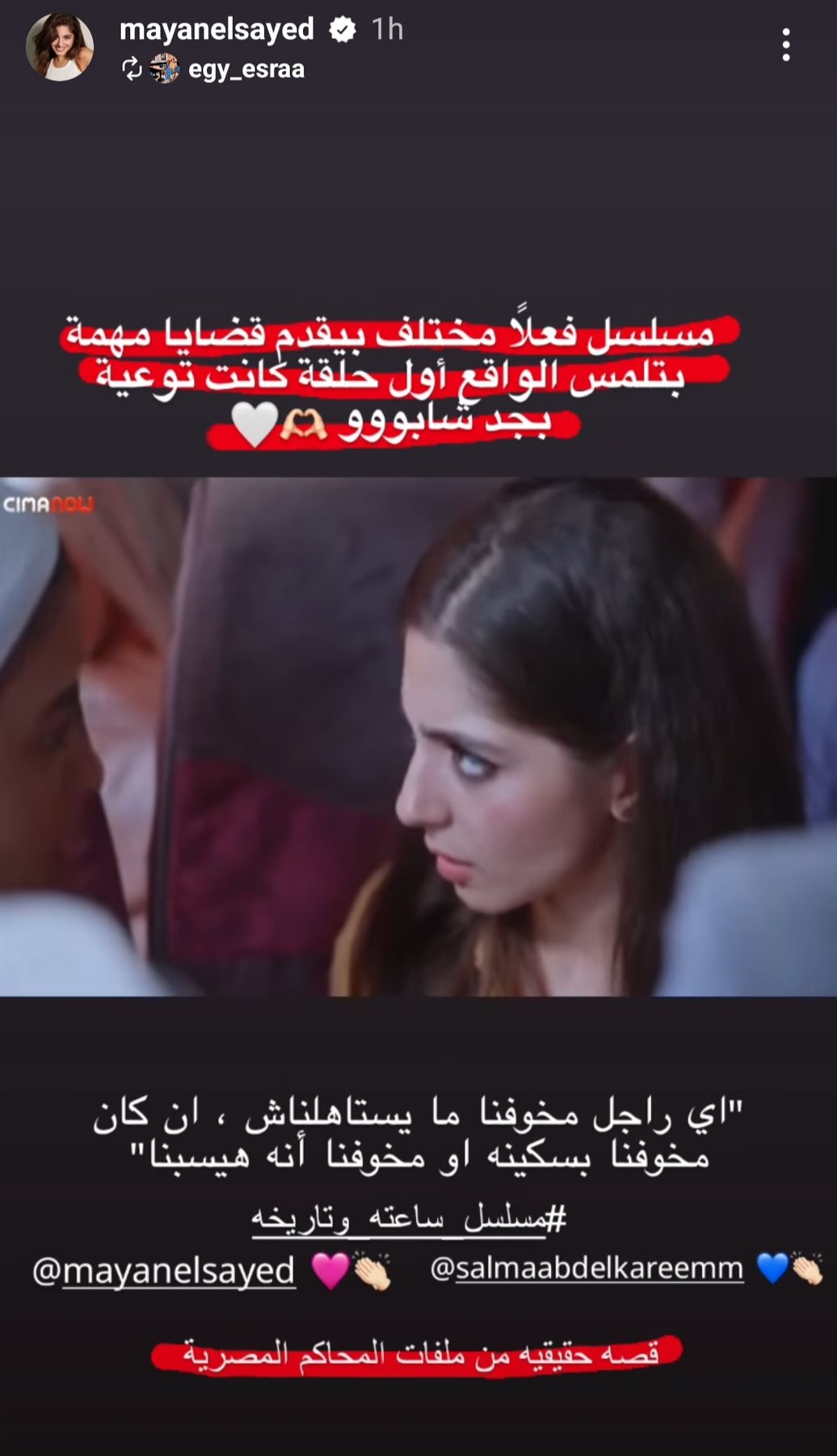 شاركت الفنانة مايان السيد في الحلقة الأولى من مسلسل ساعته وتاريخه الذي بدأ عرضه عبر الفضائيات بالأمس، وجسدت مايان السيد شخصية فتاة تعرضت للقتل على يد شاب أمام الجامعة، وبعد نجاح الحلقة وتصدرها التريند أشادت مايان السيد بالمسلسل بسبب تناوله قضايا حقيقية وهادفة وذلك عبر حسابها الرسمي على موقع تبادل الصور والفيديوهات انستجرام.