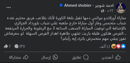 وكتب أحمد شوبير عبر فيسبوك، مباراة أورلاندو بيراتس دمها تقيل بلغة الكورة لأنك بتلاعب فريق محترم عنده شباب متحمس.