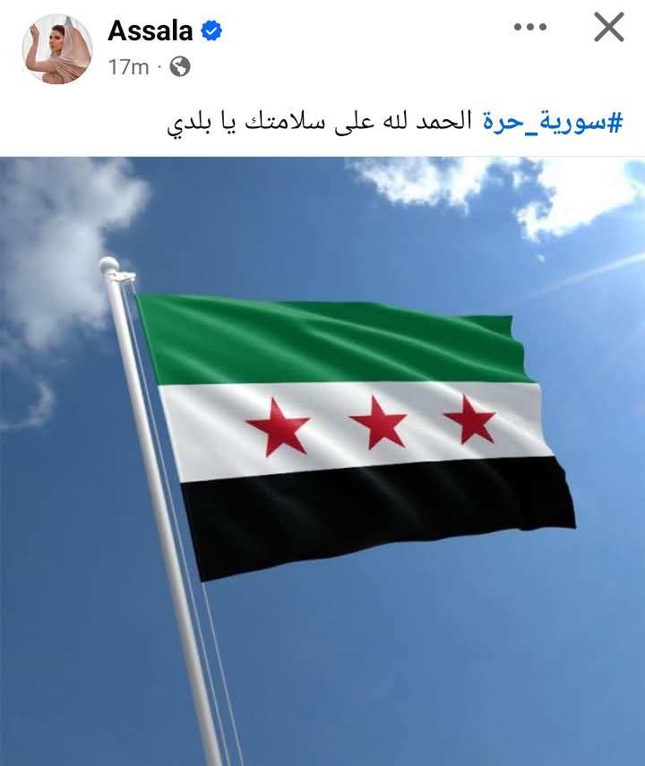 ونشرت أصالة عبر موقع فيسبوك في منشور رصده موقع تحيا مصر صورة لعلم سوريا، وعلقت عليها احتفالا بسقوط نظام بشار الأسد بعد سنوات عديدة: سورية حرة والحمدلله على سلامتك يا بلادي.