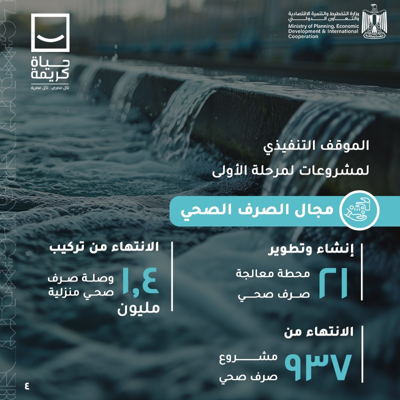 كما تطرق التقرير إلى الموقف التنفيذي للمشروعات في مجال الصرف الصحي، حيث أوضح التقرير استحواذ قطاع الصرف الصحي ومياه الشرب على حوالي 50% من مخصصات المرحلة الأولى، مع الانتهاء من إنشاء وتطوير 21 محطة معالجة صرف صحي، والانتهاء من 937 مشروع صرف صحي، والانتهاء كذلك من تركيب 1.4 مليون وصلة صرف صحي منزلية.