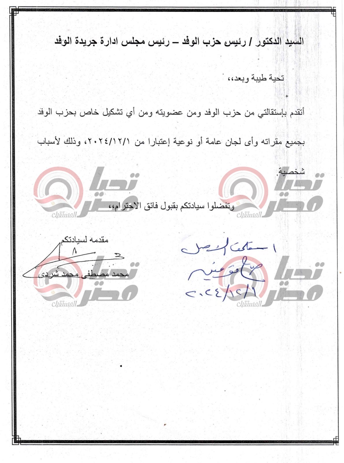 تقدم الاعلامي محمد مصطفى شردي القيادي بحزب الوفد باستقالته من حزب الوفد وكافة تشكيلاته بجميع مقراته واي لجان عامة او نوعية اعتباراً من 1 ديسمبر 2024 .