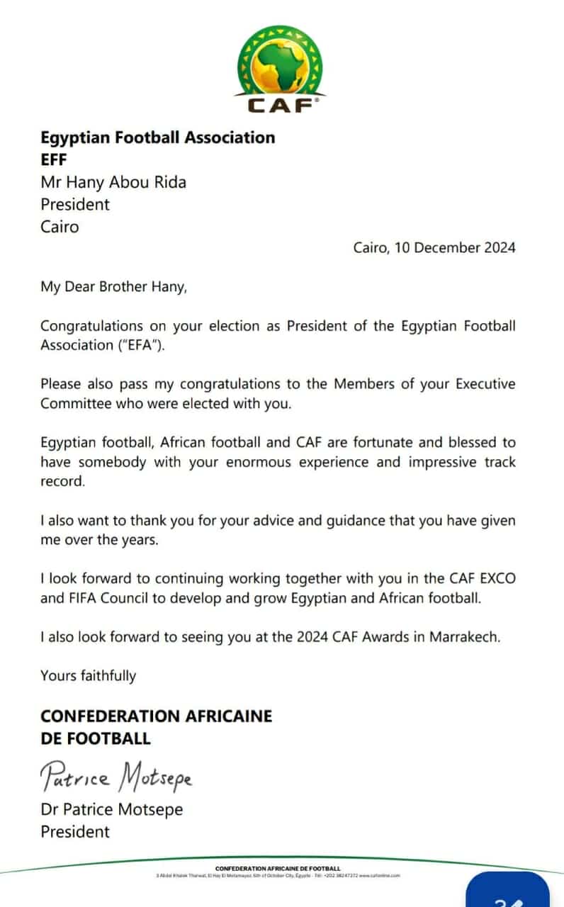 فيما أكد موتسيبي رئيس الكاف في خطابه للمهندس هاني أبوريدة، أنه يتوجه بالتهنئة لكافة أعضاء مجلس الإدارة المنتخب الجديد، مشددا أن كرة القدم المصرية والأفريقية، تسعد بوجود شخص مثل أبوريدة معها يمتلك كل هذه الخبرات والطموح.