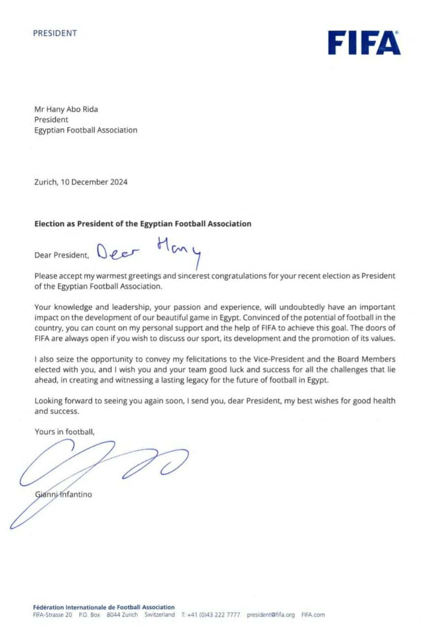 وقال إنفانتينو في خطابه لرئيس اتحاد الكرة المصري الجديد، إنه يثق في أن خبرته وقيادته ستقود الكرة المصرية واللعبة الشعبية الأولى إلى التطور والتقدم، وأن وجوده على رأس قيادة الكرة في مصر، ستساعد الفيفا على تحقيق أهدافها في تطوير اللعبة في مصر، وأبواب الفيفا مفتوحة دائما أمامه لمناقشة أي تطوير في كرة القدم مستقبلا بخوص الكرة المصرية.