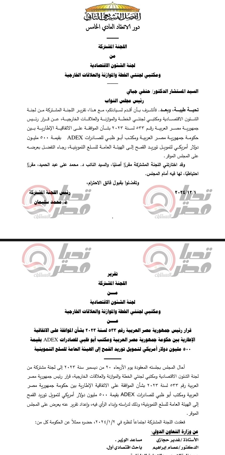 استعرض النائب محمد سليمان، رئيس لجنة الشئون الاقتصادية بمجلس النواب،تقرير اللجنة بشأن قرار رئيس جمهورية مصر العربية رقم ٥٣٣ لسنة ٢٠٢٣ بشأن الموافقة على الاتفاقية الإطارية بين حكومة جمهورية مصر العربية ومكتب أبو ظبي للصادرات ADEX لتمويل توريد القمح إلى الهيئة العامة للسلع التموينية.