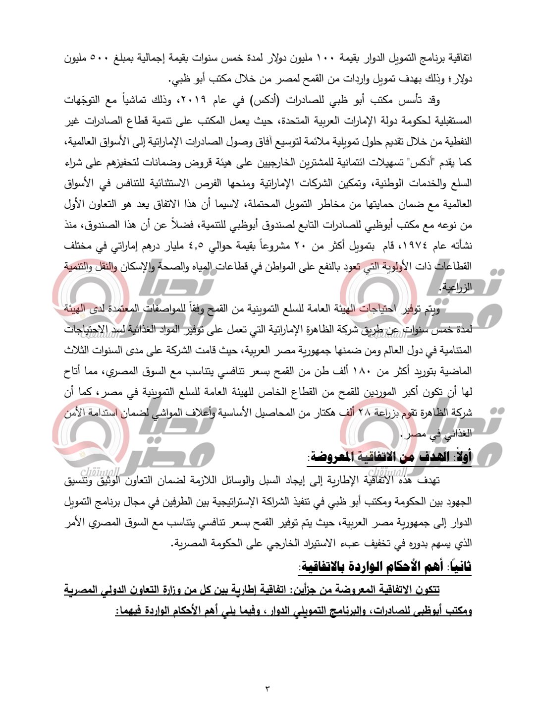 تم الاتفاق على البرنامج التمويلي الدوار بين مكتب أبوظبي للصادرات والهيئة العامة للسلع التموينية بما لا يجاوز مبلغ تمويل سنوي وقدره ۱۰۰ دولار أمريكي مائة مليون دولار أمريكي)، يتولى المكتب توفيرها للهيئة، ويتم تجديدها سنوياً لمدة خمس سنوات بحد أقصى لا يتجاوز مبلغ إجمالي وقدره ٥۰۰,۰۰ دولار أمريكي (خمسمائة مليون دولار أمريكي) في برنامج تمويل توريد حبوب القمح والسلع التموينية إلى جهورية مصر العربية، على أن يكون ذلك الاتفاق التمويلي بالاقتراض بضمان سيادي من وزارة المالية المصرية، ويكون التوريد من قبل شركة الظاهرة الزراعية.