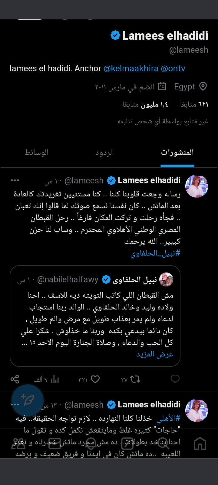وقالت لميس الحديدي في منشور رصده موقع تحيا مصر عبر موقع التدوينات القصيرة "إكس"ناعية نبيل الحلفاوي: رسالة وجعت قلوبنا كلنا، كنا مستنيين تغريدتك كالعادة بعد الماتش، كان نفسنا نسمع صوتك لما قالوا إنك تعبان فجأة رحلت وتركت المكان فارغًا، رحل القبطان المصري الوطني الأهلاوي المحترم، وساب لنا حزن كبير.. الله يرحمك.