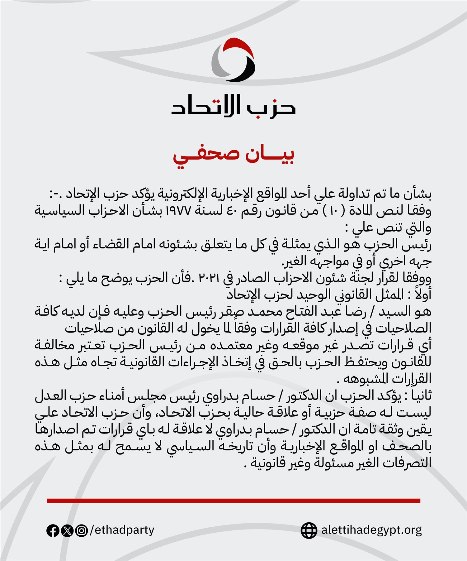 ونوه الحزب بأنه وفقا لقرار لجنة شئون الأحزاب الصادر في 2021، فأن الممثل القانوني الوحيد لحزب الإتحاد هو رضا عبد الفتاح محمد صقر رئيس الحزب وعليه فإن لديه كافة الصلاحيات في إصدار كافة القرارات وفقاً لما يخول له القانون من صلاحيات.