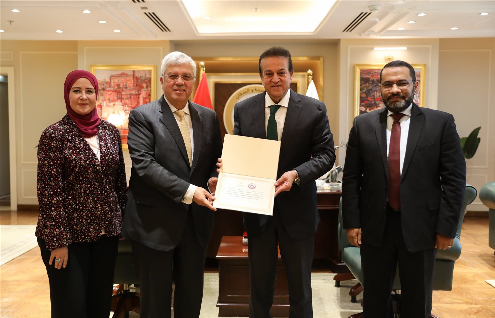 الدكتور خالد عبدالغفار يسلم وزير التعليم العالي وثيقة استلام أول شحنة من العقار لعلاج التليف الكيسي