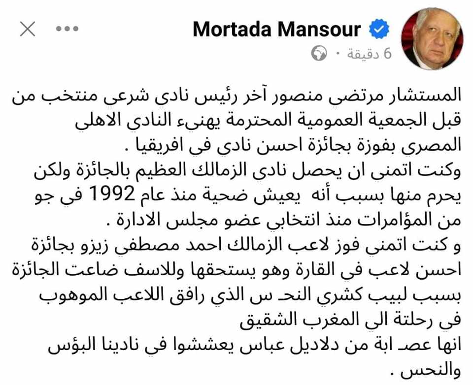 وكتب المستشار مرتضي منصور على فيس بوك، المستشار مرتضي منصور آخر رئيس نادي شرعي منتخب من قبل الجمعية العمومية المحترمة يهنيء النادي الاهلي المصري بفوزة بجائزة أحسن نادي في افريقيا.