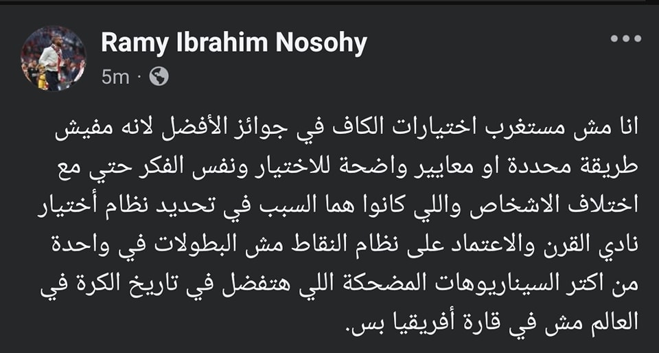 وكتب رامي نصوحي في رسالة عبر فيس بوك، أنا مش مستغرب اختيارات الكاف في جوائز الأفضل لأنه مفيش طريقة محددة أو معايير واضحة للاختيار ونفس الفكر حتى مع اختلاف الأشخاص واللي كانوا هما السبب في تحديد نظام اختيار نادي القرن.